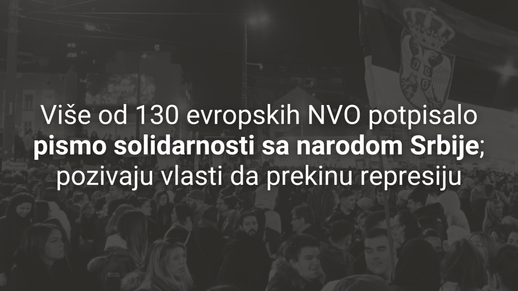 Preko 130 evropskih nevladinih organizacija potpisalo je izjavu u kojoj se izražava solidarnost sa narodom Srbije, pozivajući vlasti da prekinu sa eskalirajućom represijom nad antikorupcijskim pokretom.