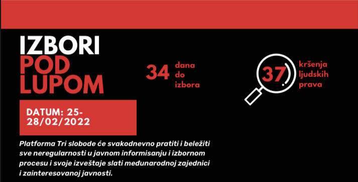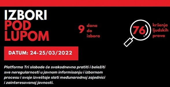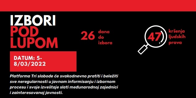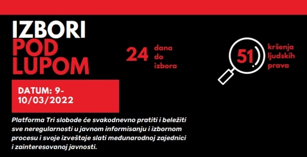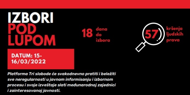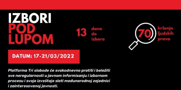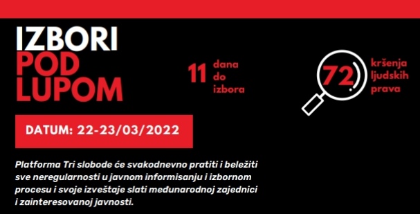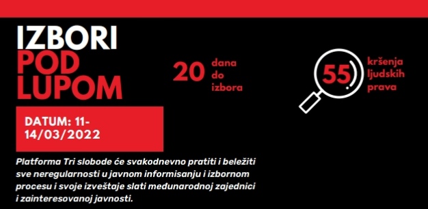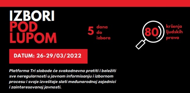 Beograd, 29. mart 2022- Civilno društvo za fer izbore – Izbori pod lupom- Organizacije civilnog društva okupljene oko platforme Tri slobode obaveštavaće javnost o svim slučajevima kršenja osnovnih ljudskih prava, kako bi se stekla što realnija slika o toku izbornog procesa i poštovanja vladavine prava u predizbornom periodu....