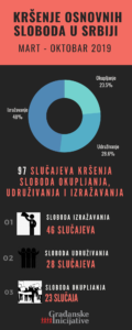 Beograd, 15. oktobar 2019. godine (Beta) – Međunarodna mreža CIVICUS smanjila je rejting Srbije iz kategorije zemalja u kojima su osnovne slobode sužene u kategoriju zemalja u kojima su osnovne slobode i građanski prostor opstruirani. Tim povodom Građanske inicijative su danas organizovale konferenciju za medije, zajedno sa kolegama iz CIVICUS-a, Balkanske mreže za razvoj civilnog društva i predstavnicima lokalnih organizacija.
