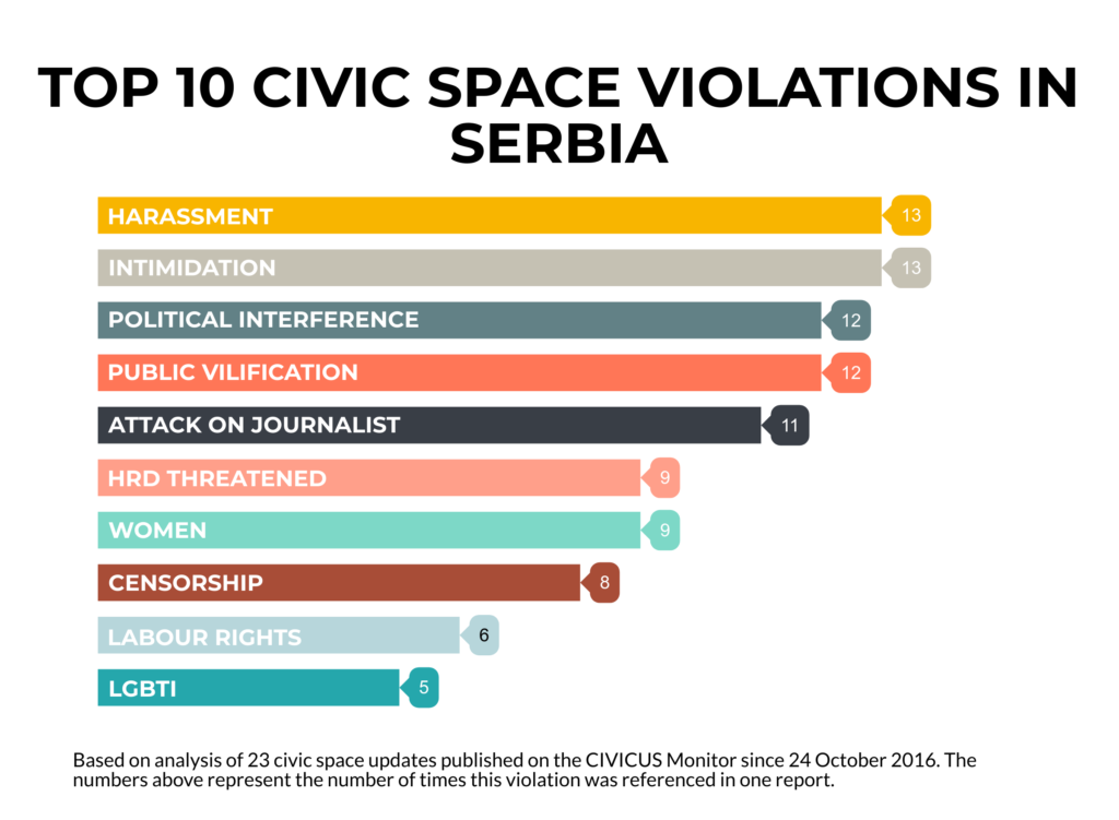 Podaci koji se koriste za Srbiju dostavljaju Građanske inicijative koje podatke prikupljaju na dva načina – kroz Platformu Tri slobode, koja prati stanje slobode udruživanja, okupljanja i izražavanja i metodologiju Monitoring matrice.