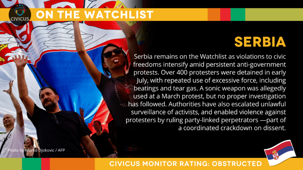30 Jul CIVICUS Monitor: Serbia Stays on Rights Watchlist as Authorities Seek to Crush Student-led Protest Movement