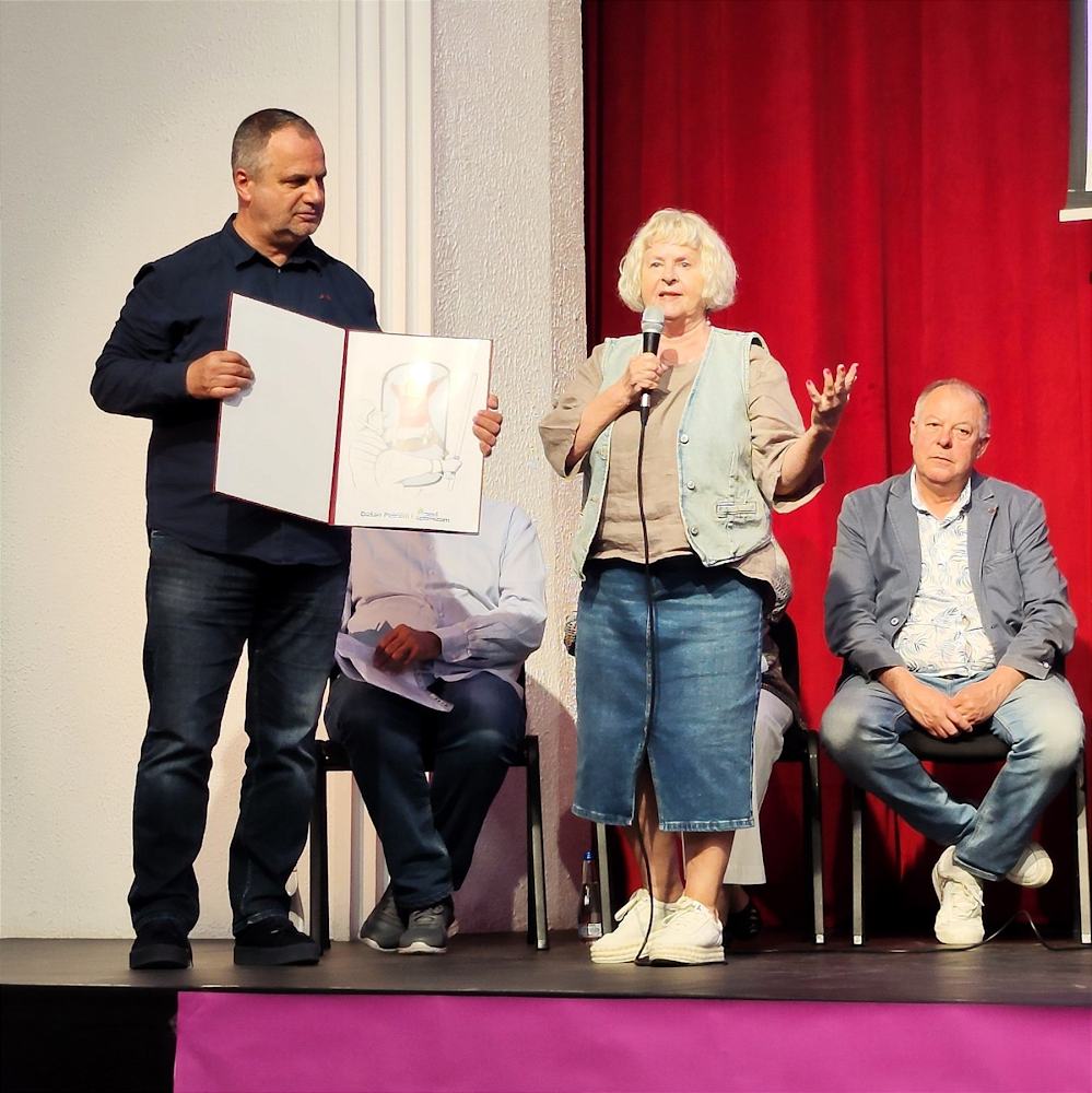 Na početku tribine, osnivač pokreta Novi Optimizam Branislav Guta Grubački uručio je plaketu-karikaturu Dušana Petričića novosadskoj aktivistkinji Oliveri Radovanović.