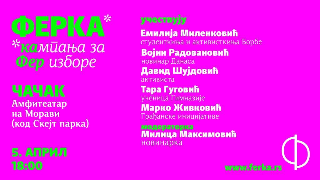 Kampanja za fer izbore – FERKA, čiji je centralni zahtev da aktuelni predsednik države Aleksandar Vučić ne bude nosilac liste na izborima na kojima se ne kandiduje, stiže u Čačak. Tim povodom, u petak, 5. aprila, sa početkom u 18.00 sati biće organizovana tribina i razgovor sa građanima u Amfiteatru na Moravi (kod Skejt parka).