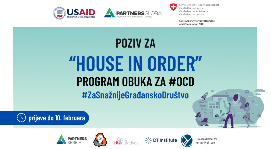 Program House in Order je namenjen organizacijama civilnog društva i drugim neregistrovanim ili novoregistrovanim organizacijama. Detaljan program obuka možete pogledati OVDE.