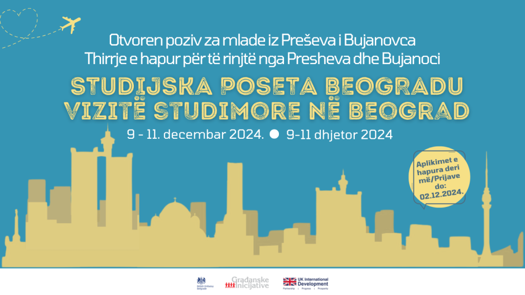 Ftojmë të rinjtë e moshës 16 deri në 30 vjeç nga Presheva dhe Bujanoci të na bashkohen në një vizitë studimore tre-ditore në Beograd, që do të mbahet nga 9 deri më 11 dhjetor 2024. Kjo është një mundësi e veçantë përmes aktiviteteve interaktive dhe bisedave frymëzuese për të hulumtuar tema me rëndësi për të rinjtë, të drejtat e njeriut dhe të ardhmen e përbashkët.
