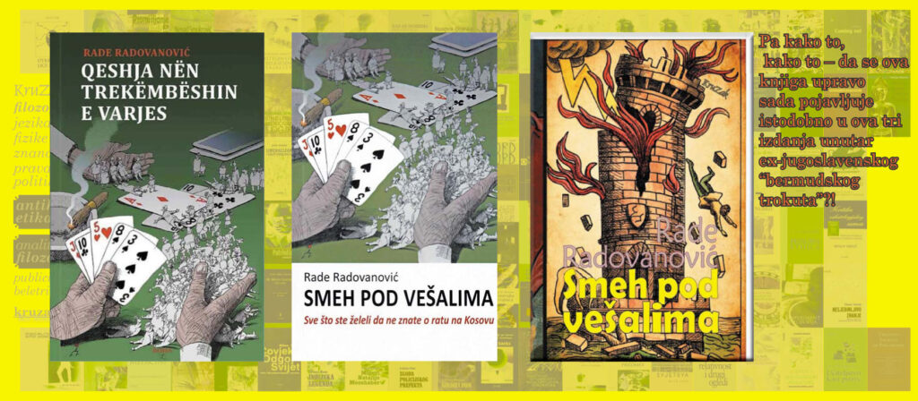 Roman Radeta Radovanovića „Smeh pod vešalima“ objavljen je u isto vreme u Beogradu, Zagrebu i Prištini, predstavlja svedočanstvo o vremenu Miloševićevog režima, govori o zločinima na Kosovu sa kojima ne želimo da se suočimo – pitajući se : Ko su heroji, a ko žrtve ?
